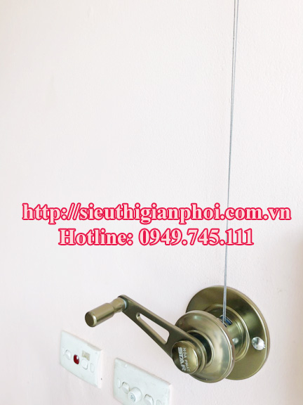 -Dùng tay quay và bộ tời để điều khiển thanh phơi hạ xuống, sau đó treo các móc quần áo vào các khuyên cố định trên thanh phơi.