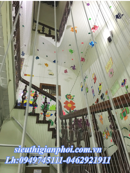 -Sau khi cố định thanh nẹp lên trần nhà và chạy dài theo cầu thang hoặc ban công chúng tôi đan lưới với khoảng cách lưới này cách lưới kia 5cm cực kỳ an toàn.